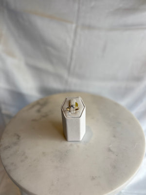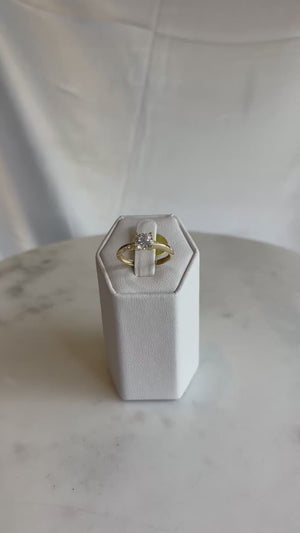 The image shows a solitaire engagement ring displayed upright on a hexagonal, ivory-colored ring stand. The ring features a prominent round-cut diamond set in a yellow gold band with a white gold or platinum prong setting, giving it a classic and elegant two-tone look.